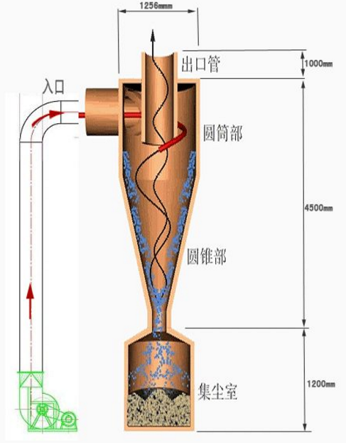 它由進風口、出風口、筒體、錐體、支架、集灰斗組成。